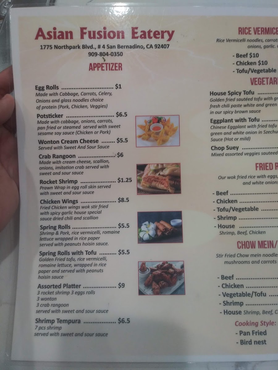 If you're in the mood for a delightful fusion of flavors, look no further than the Asian Fusion Eatery Menu. Located at 1775 Northpark Blvd W #4, San Bernardino, CA, this eatery brings together the best of Asian cuisines, blending traditional dishes with creative twists. From savory stir-fries to fresh sushi rolls, each item on the menu is crafted with care and high-quality ingredients. Whether you're craving something light and fresh or a hearty meal, there’s something to satisfy every palate. With an inviting atmosphere and a menu that showcases bold flavors and innovative combinations, Asian Fusion Eatery is sure to make your dining experience memorable.